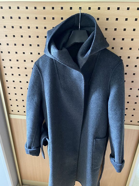 Puikus ilgis, ilgos rankovės, dvipusis diržas (aksomo/vilnos audinio). Tiesus kirpimas.