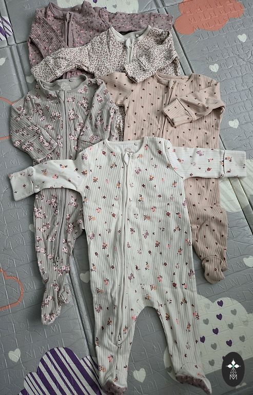 4 Lindex pižamos, naudotos. Užtrauktuko spalva šiek tiek nusitrynusi, nebe tokios ryškios, baltumas jau nebe toks baltas, kai kurių apykaklė gelsvesnė, nes skalbta švelniai. Didelių dėmių ir skylių nematau.
