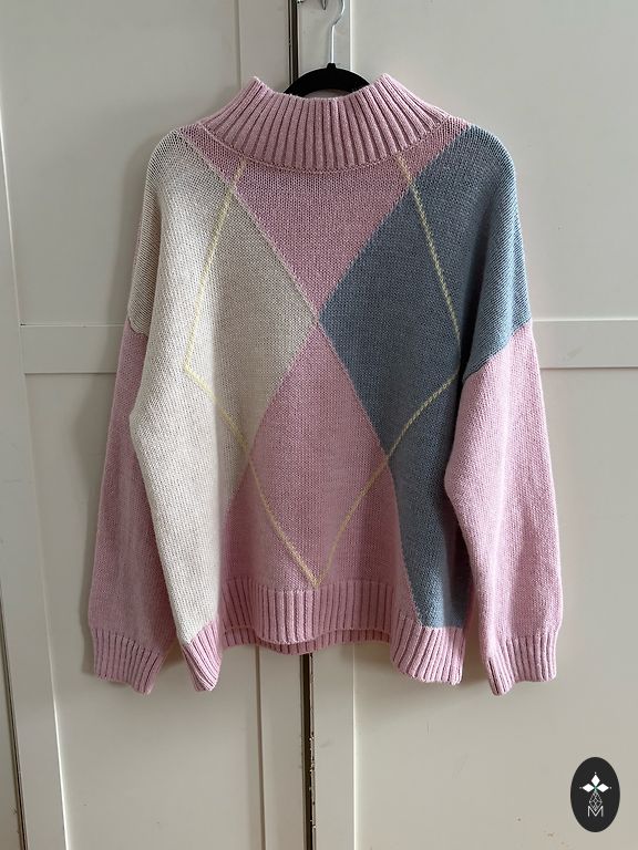 XL/ 2XL Laisvas, šiltas megztinis, priekinė dalis trumpesnė 56 cm, galinė dalis ilgesnė 74 cm. Rankovių ilgis 68 cm.