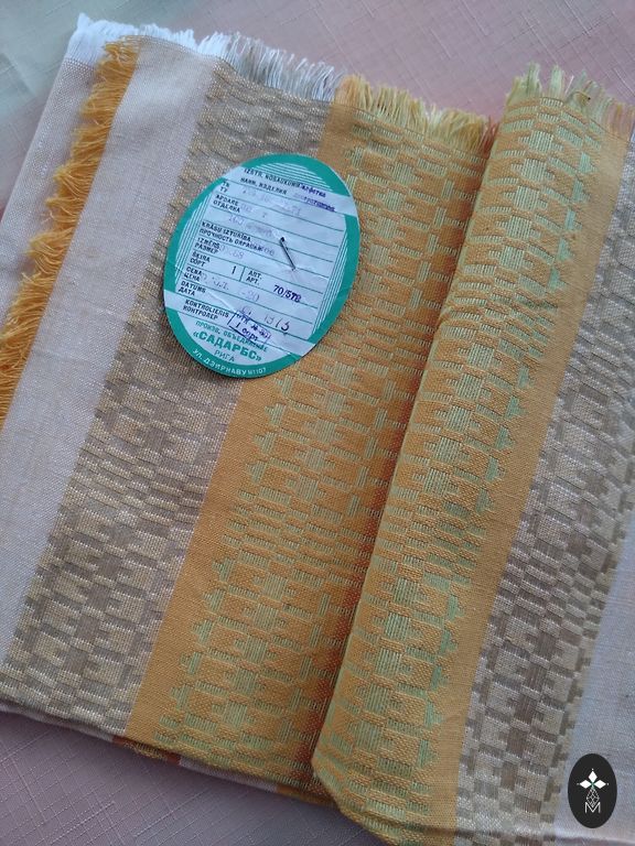 Alyvinė suknelė su pilku raštu. Pagaminta Latvijoje iš minkšto švelnaus gobeleno. Ilgis 92 cm. Nuo pažasties iki pažasties 52 cm. Rankovės nuo peties 60 cm, platintos. Apačia šiek tiek siauresnė.