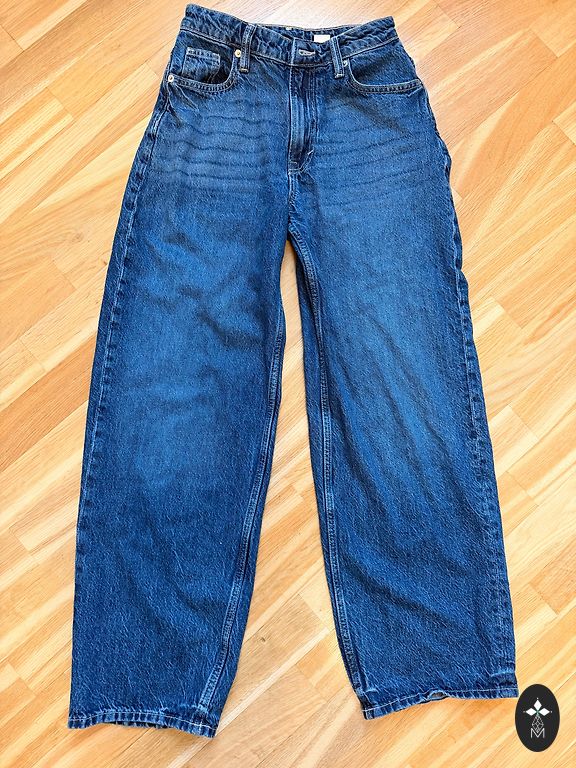 Moteriški džinsai su aukštu liemeniu, 33 dydis (L/XL). Liemens - 41 x 2 cm, klubai - 51 x 2. Kelnės elastingos. Kelnių ilgis - 113 cm, vidinės siūlės ilgis - 82 cm.