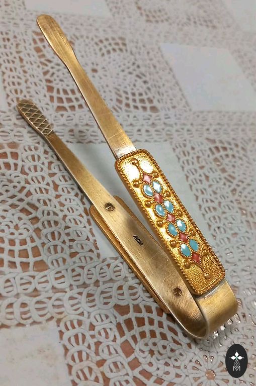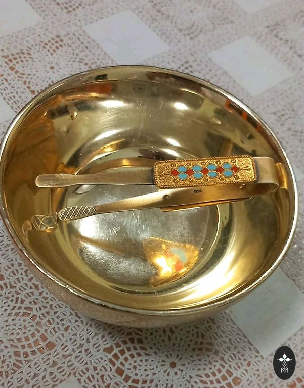 Vintage melchior caviar dish, 6.5 cm in diameter, 3.5 cm high. Made in Russia in 1970. Enamel coating, rowan berries with leaves. Spoon covered with gold.