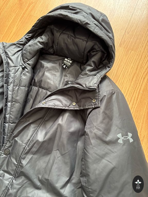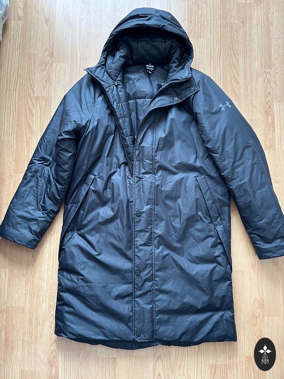Prailginta viršutinė striukė-parka. Nugara prailginta. Tarpsezoninė, ilgis 88 cm, rankovės 68 cm, pečiai 49 cm, pažastys 58 cm.