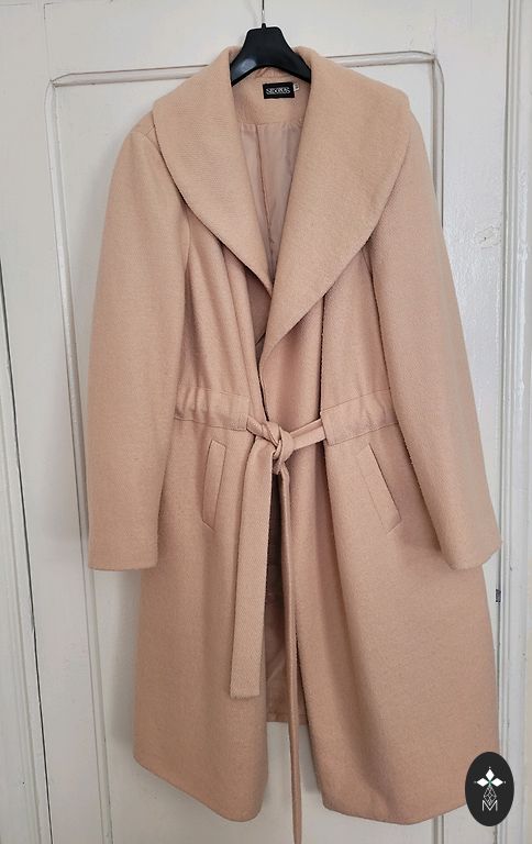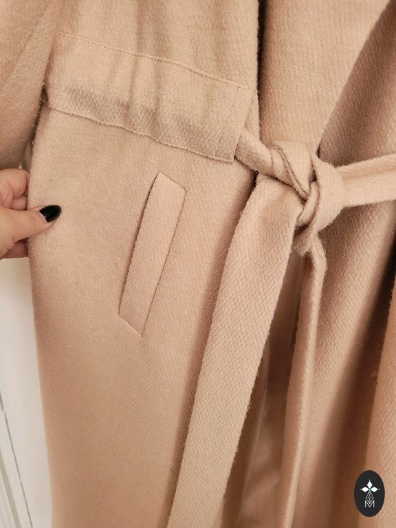 Smėlio spalvos vilnonis paltas - sagos užsegimas, dvi kišenės, reglano rankovės.