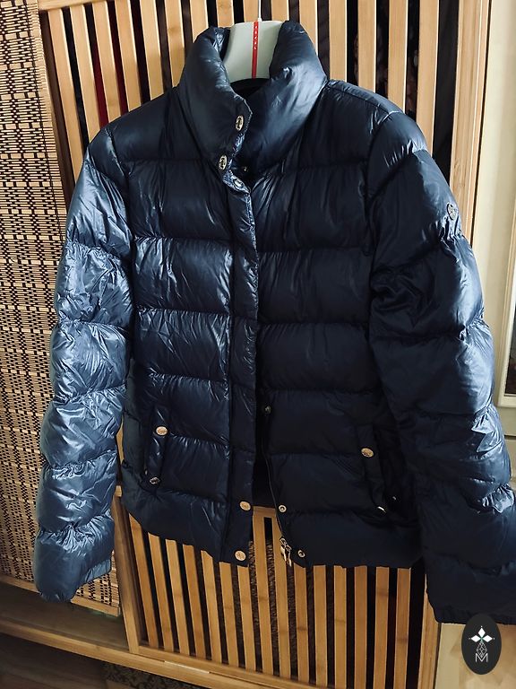 Stylish and warm winter jacket in brown and dark blue. With a fluffy fur trim on the hood, embroidery details, and several zippered pockets. Comfortable, warm, and practical for everyday use in cold weather, excellent for skiing. In excellent condition!