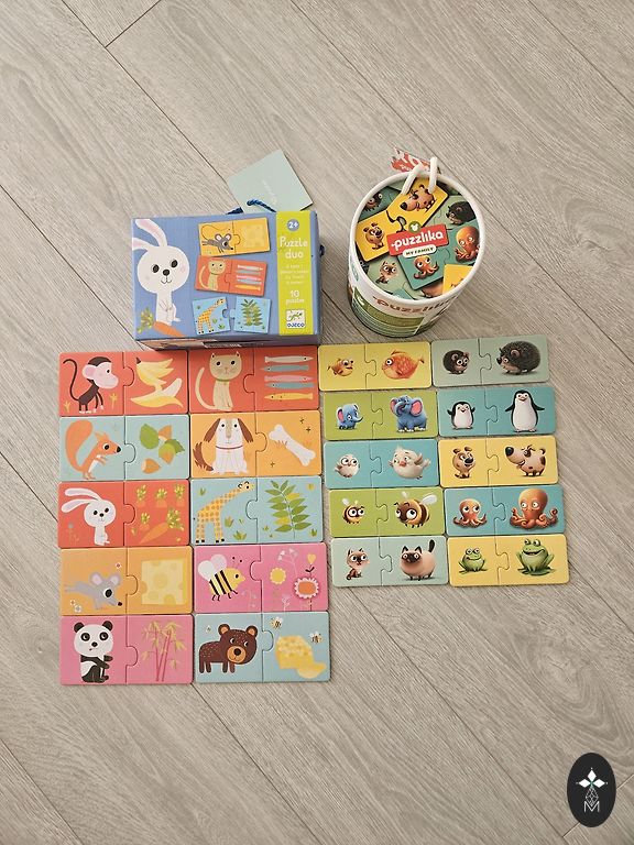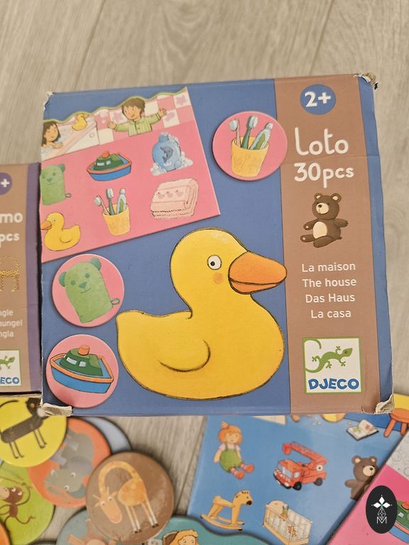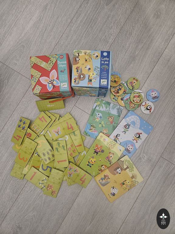 Kolme mängu komplekti, kõik väga heas seisukorras, ainus defekt, mida märkan, on puidust pusle puuduv tükk ja Djeco liblikamängul puudub üks žetoon. Pole midagi näritud ega katki, oleme neist välja kasvanud, aeg teisele omanikule 😊