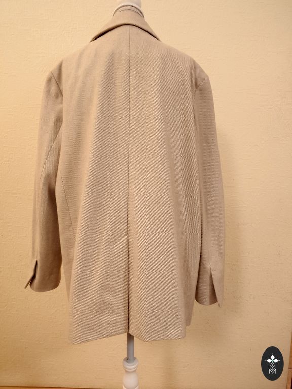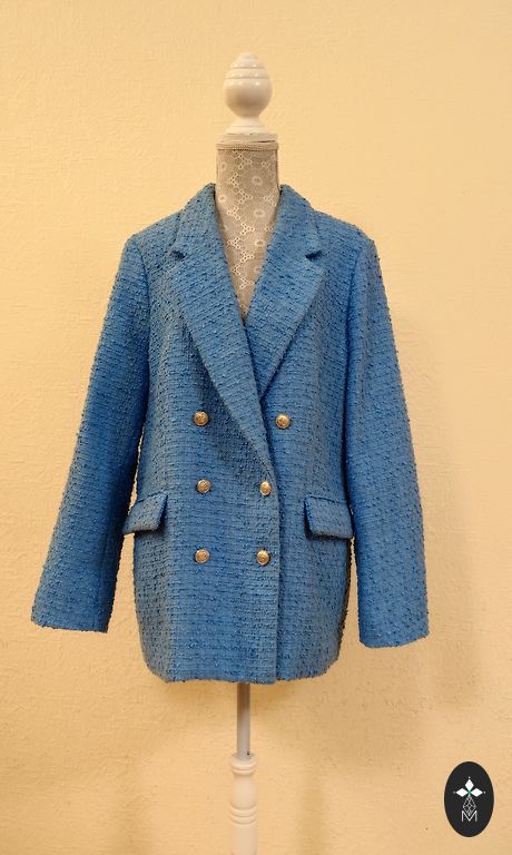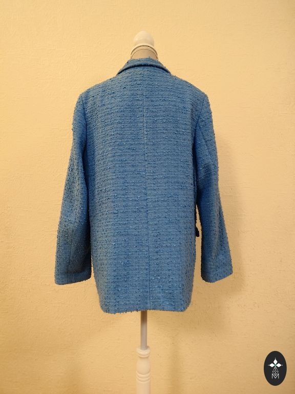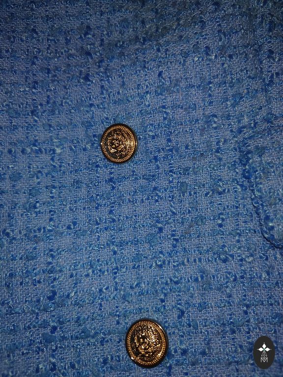 Buklė audinio švarkas su baltais, mėlynais ir auksiniais siūlais, rankovės, kišenės ir apačia dekoruotos siūlais. Yra kišenės, užsegimas su auksiniais sagomis. 38 dydis, nugaros ilgis 69 cm, rankovės ilgis 63 cm, nuo pažasties iki pažasties 51 cm.