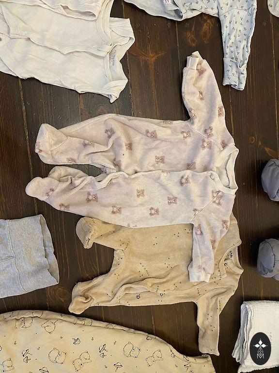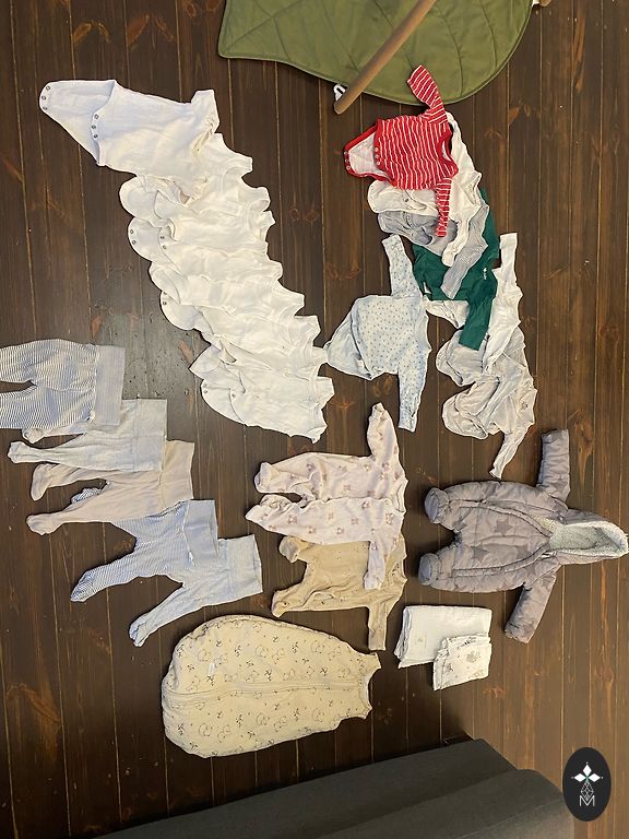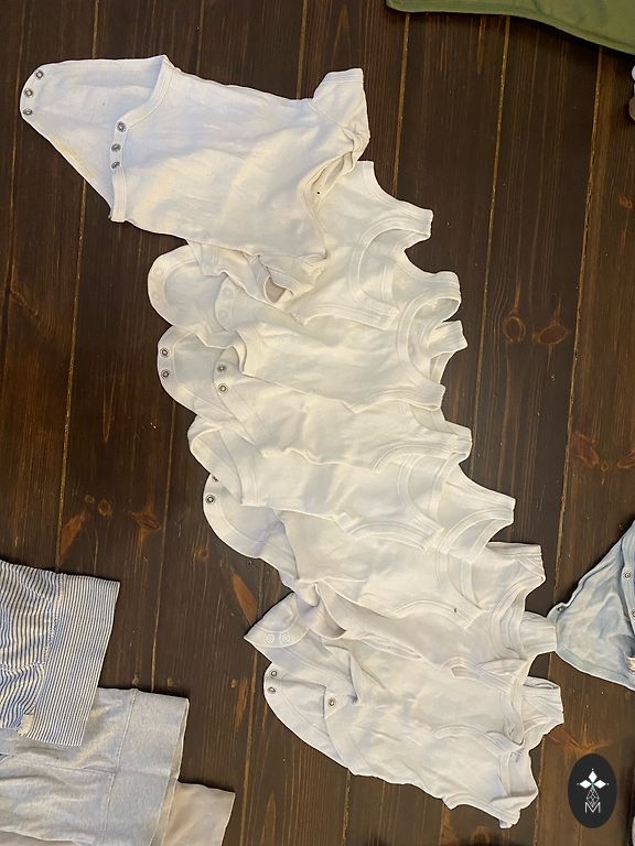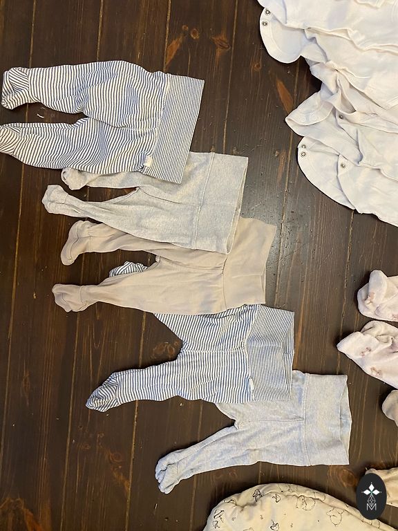 No holes or stains, the color has slightly faded from washing. Washed only with baby detergents. Size 62. Will fit longer because it has two rows of buttons. Pants are very comfortable.