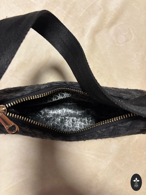 A black bag with a clip can be closed and additionally there is a large wallet where you can put a lot with a zipper.