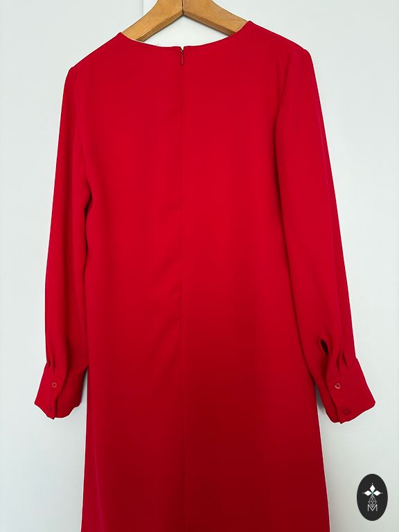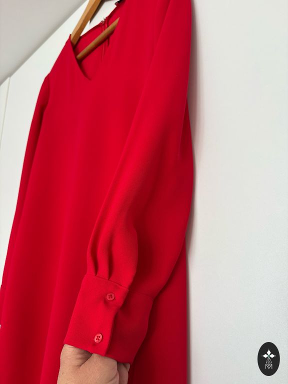 Graži raudona suknelė su baltais žirneliais. Užvilkta teminiam renginiui, kur močiutės nerti staltiesės, išsiuvinėti servetėlės, romantiškos puodeliai ir pyragaičiai su medetkų žiedais... ak! Krūtinėje perteklius, juosmenyje guma, apačioje volanas. Poliesteris + elastanas. Pečiai 46 cm