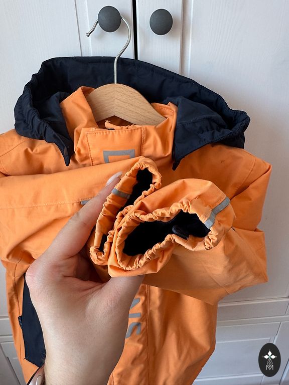 Kvaliteetne jakk ilma defektideta, helkurid varrukatel ja õlal. Nööbitav kapuuts. Ei ole mõeldud talveks, pigem jahedaks kevadeks.