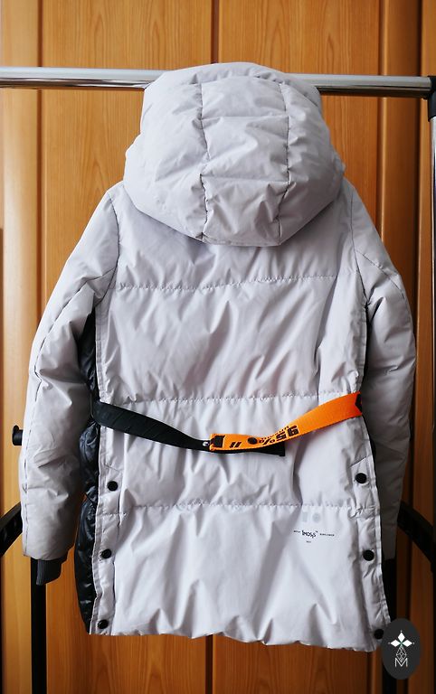 Asümmeetrilise alumise osaga, on tasku. Rinnaümbermõõt 55 cm, pikkus 114 cm.