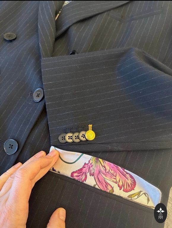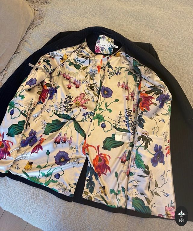 Auksinė furnitūra, fuksijų rožinės odos apdaila, gėlių motyvo drobinis audinys.