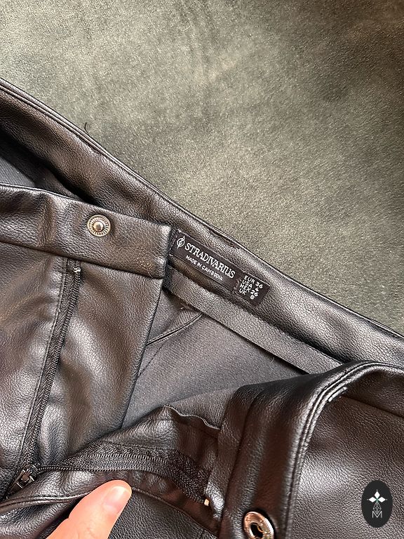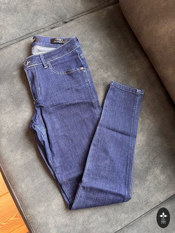 Tamprūs džinsai, skylė ant dešiniojo kelio, užtrauktukai prie kišenių.