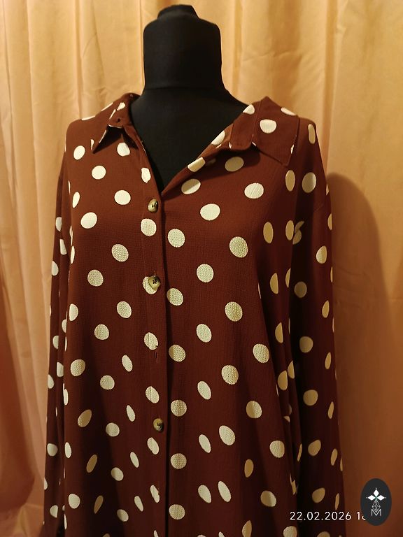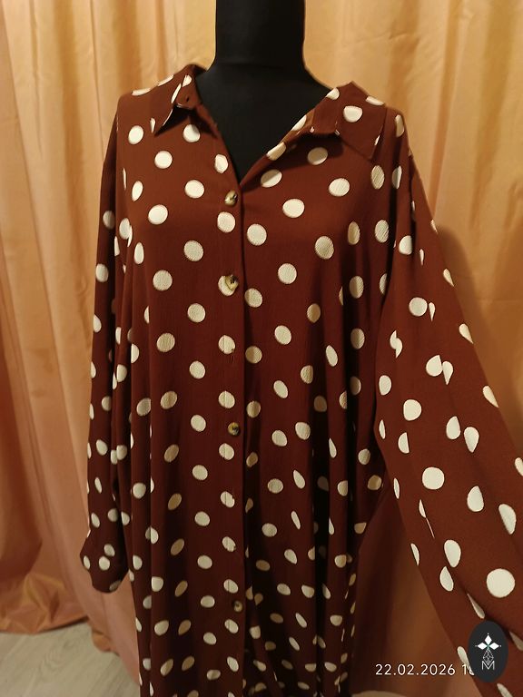 A thin, pleasant fabric, bright dress. The dress is comfortable, falling freely with a thin belt. Bust 128, length 133 cm. Indicated sizes UK 22, EU 50