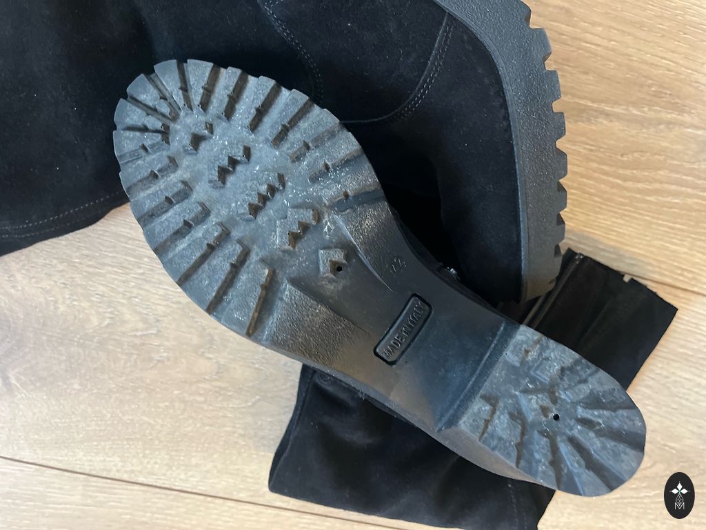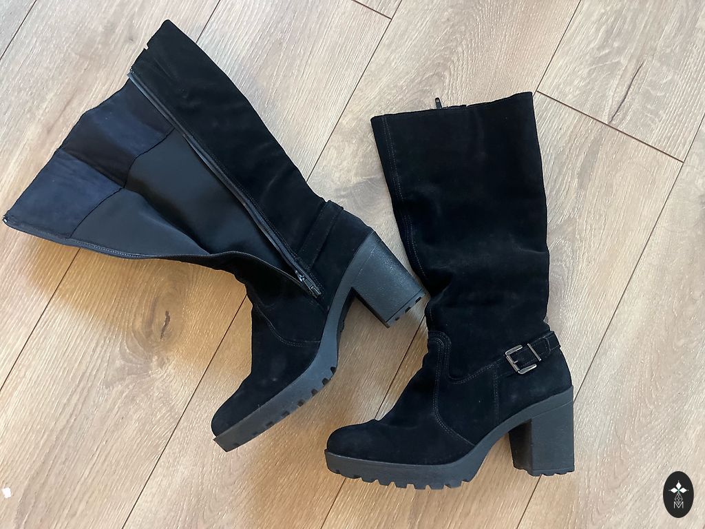 Very comfortable and elegant tall boots. Worn a few times, unfortunately no longer fit. Heel 8cm, upper edge 20cm. Overall in good condition, no significant defects, only minor signs of use.