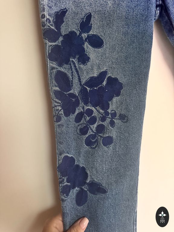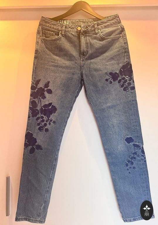 Diezgan bieza auduma ar drusciņ elastānu, sastava var redzēt. Stilīgi gali un ne pārāk spilgta balinājuma efekts. Bikses nav skinny, bet es teiktu starp Slim un Straight cut. Viduklis 43cm, garums no vidukļa 101cm