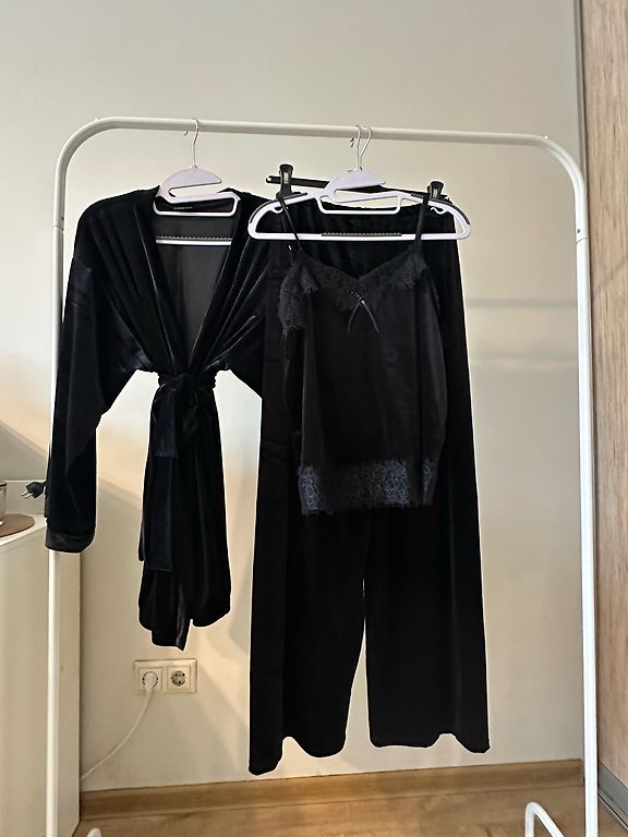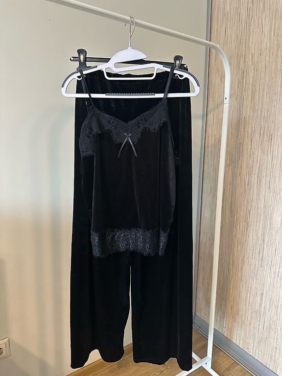 Eleganti rinkinys su švelnia tekstūra ir juoda nėrinių apdaila.