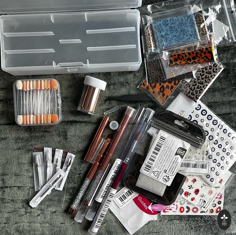 Komplektis tangid, küünenaha tõukur, viil 100/180, freeside otsikud ja aksessuaar.