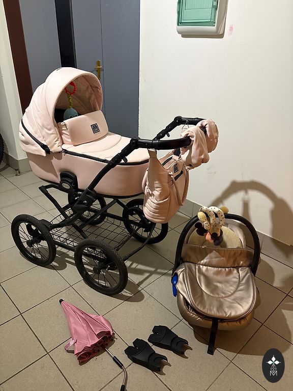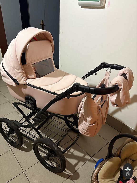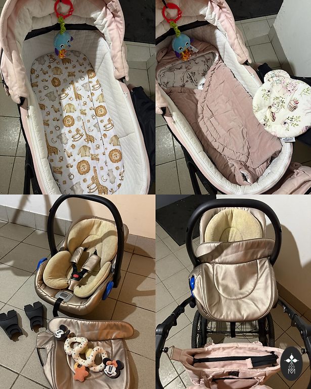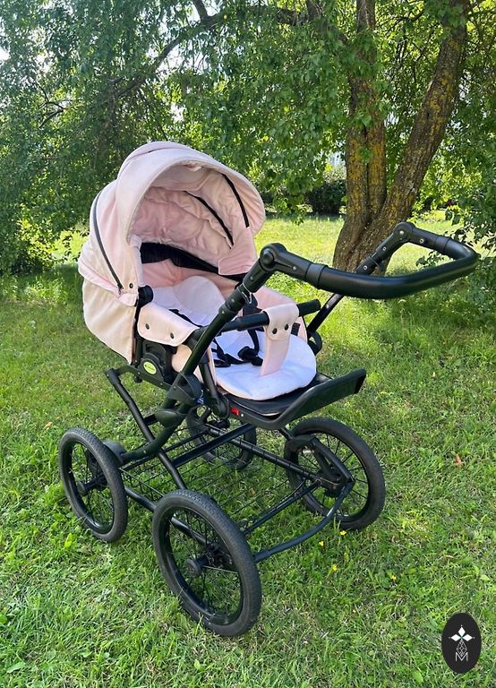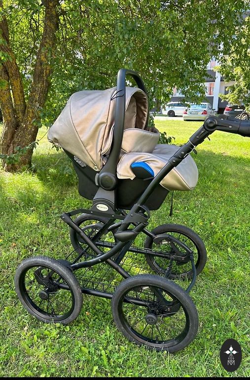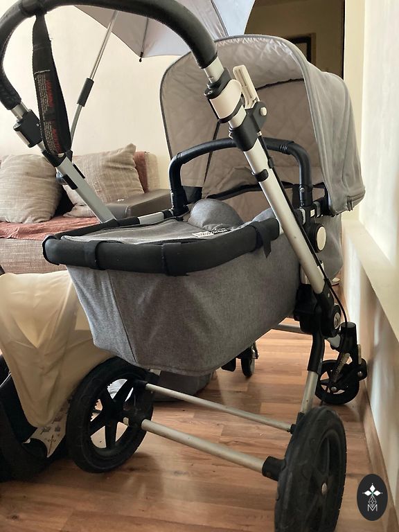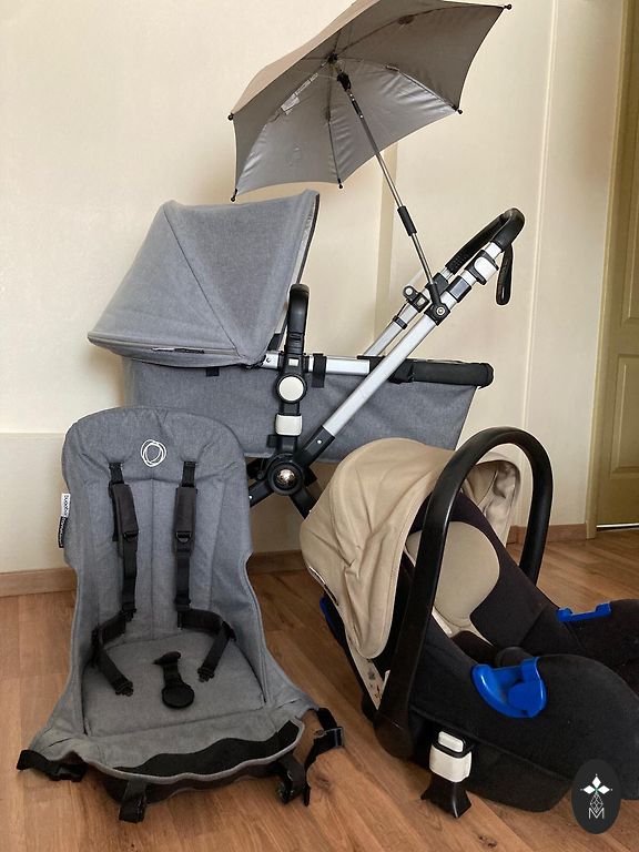 Vaikiškas vežimėlis Bugaboo Cameleon3, 3-1, gulėjimo, sėdėjimo ir automobilinė kėdutė (MaxiCozy). Komplekte taip pat yra laiptelis antram vaikui sėdėti ir papildomi priekiniai ratai važiavimui per sniegą/smėlį.