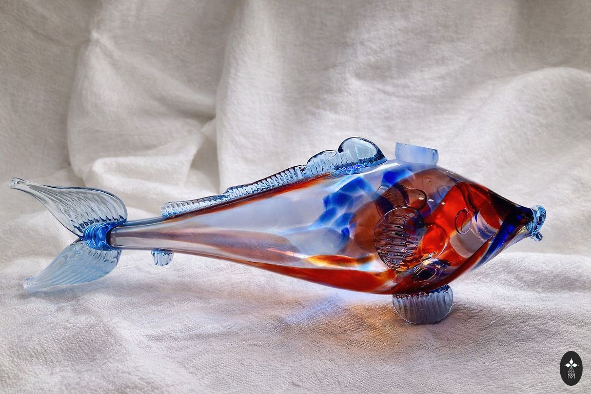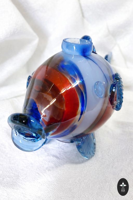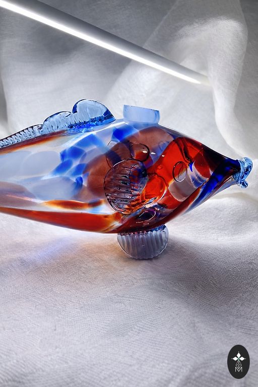 Elegant glass vase with an astonishing floral pattern in white and blue on a dark background. The inside of the vase is made of red-colored glass. The entire vase is crafted from a single mass of glass, weighing 3.3 kg. The vase has been used a couple of times, in perfect condition, with no scratches, cracks, or chips. Selling because the vase's colors do not match my interior.