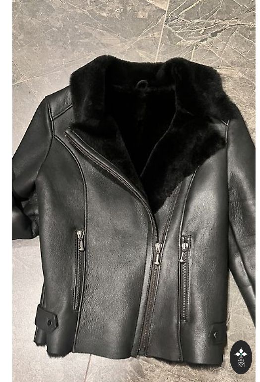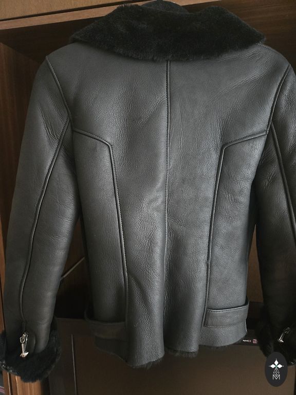 Moteriška juoda aviatoriaus stiliaus avikailio striukė su kailiniu apykakle ir gobtuvu, sukurta motociklininko striukės stiliumi, dekoruota diržu su sagtimi apačioje.