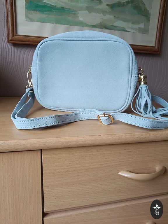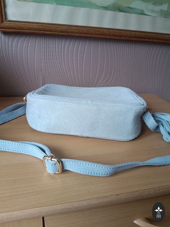 Šviesiai mėlyna spalva, aukso furnitūra, ilga peties dirželis, užsisega - žr. 4 nuotrauką