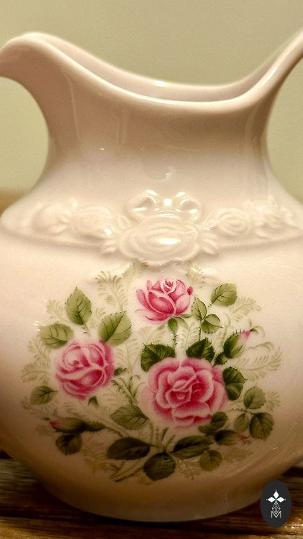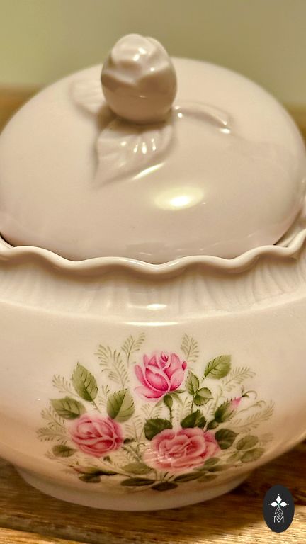 Šis nuostabus vokiškas porceliano indas yra tikras amatininkų šedevras, papuoštas žavingu perlamutro (liustros) glazūros spindesiu. Centre yra prabangus žydinčių rožių puokštė, apsupta gilios bordo spalvos juosta ir subtiliais 22 karatų aukso filigraniniais raštais. Banguoti kraštai ir reljefiniai įspaudai suteikia indui rafinuotą skulptūrinę dimensiją.