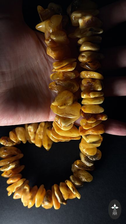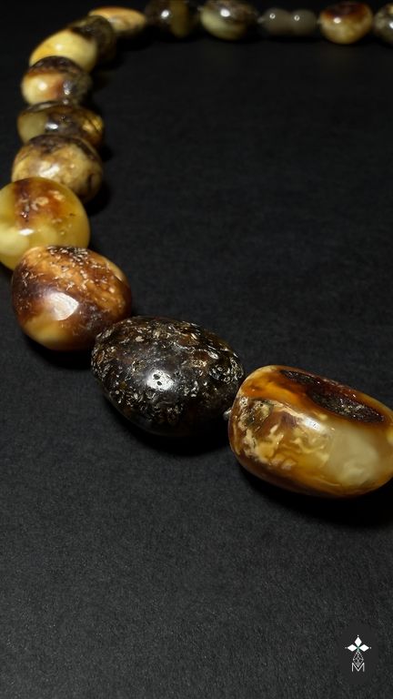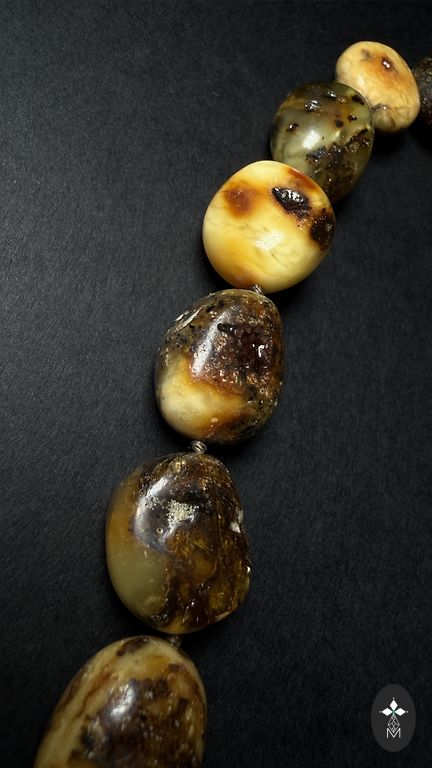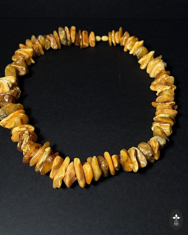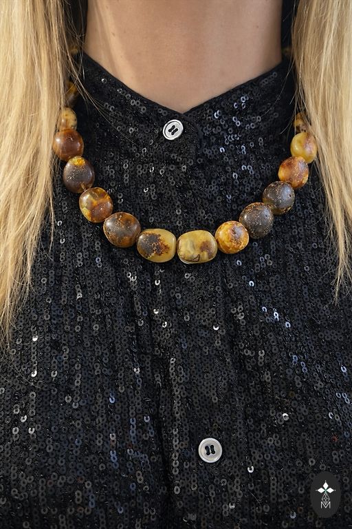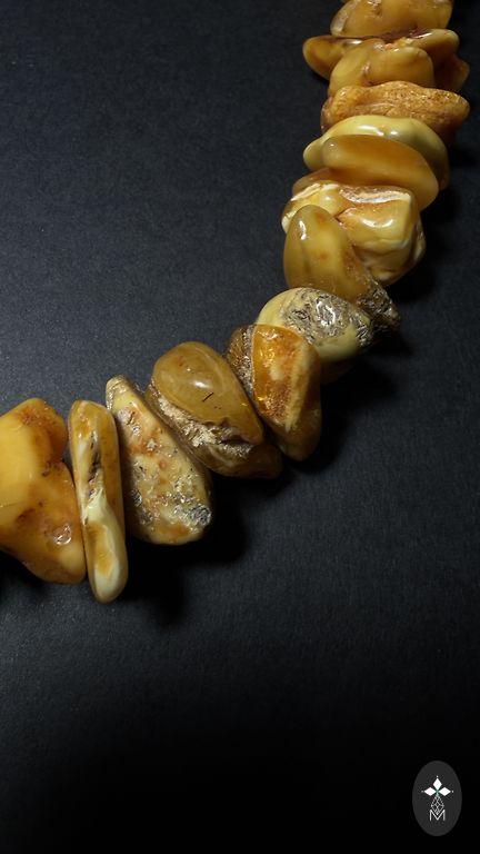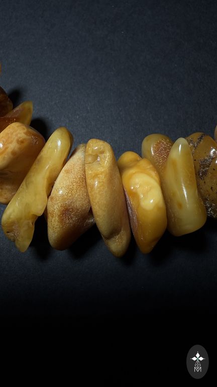 Masinė apyrankė iš įvairių atspalvių natūralaus gintaro. Svoris 58g. Ant gumos.