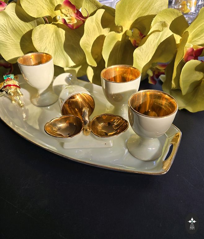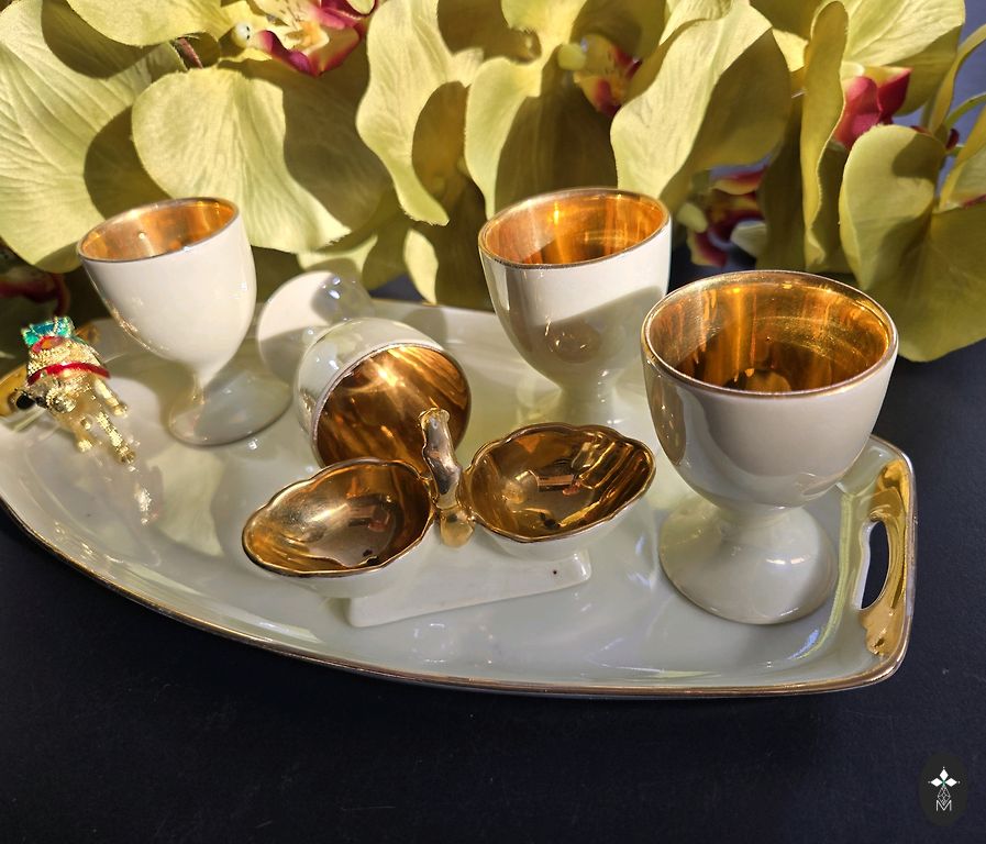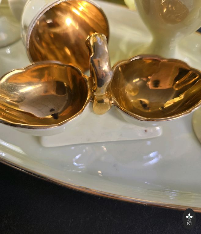 Keramikos kavos trio – puodelis, lėkštutė ir lėkštė. Šiltai rudi ir ochros tonai su koncentrinių juostų dekoru. Stora keramika su blizgia glazūra. Geros būklės, be įtrūkimų ir skeveldrų.