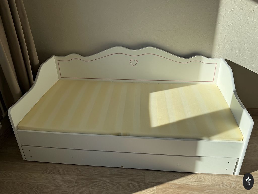 Medinė lova. Kai kur yra įbrėžimų. Lipdukus pašalinsiu. :)
