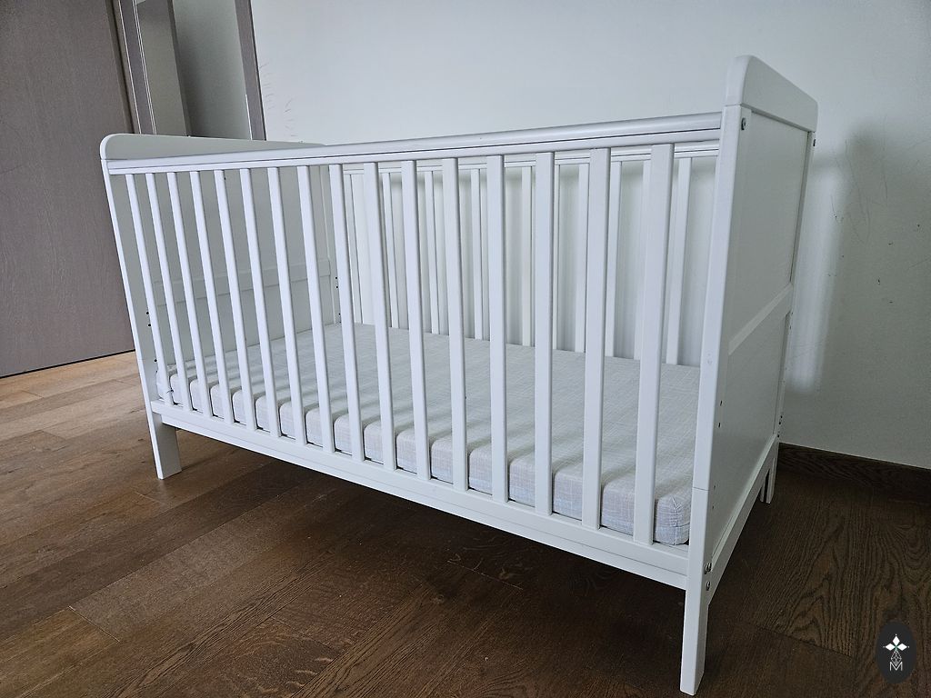 У кроватки три уровня высоты – от самого низкого до самого высокого, а также колеса для удобства перемещения. Изготовлена из натурального дерева, надежный и качественный бренд.
