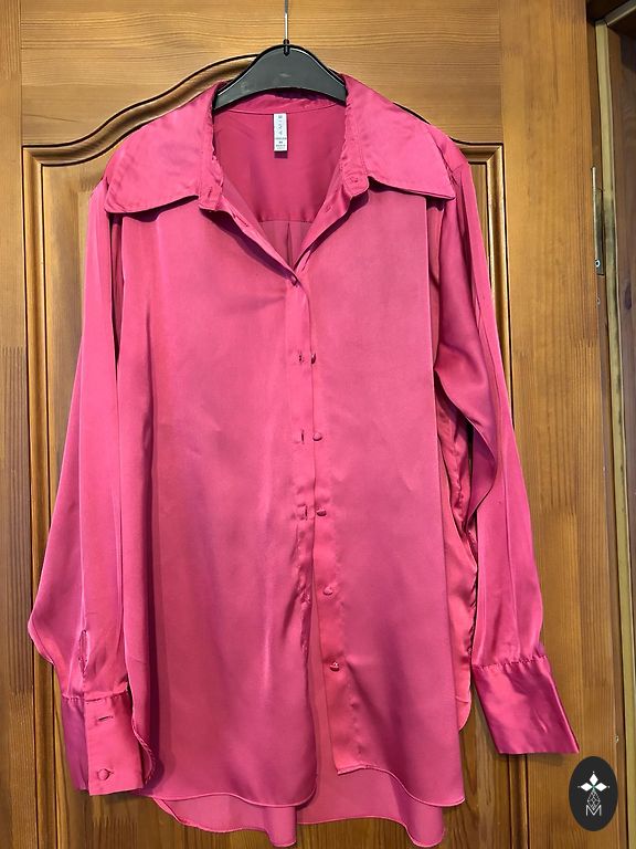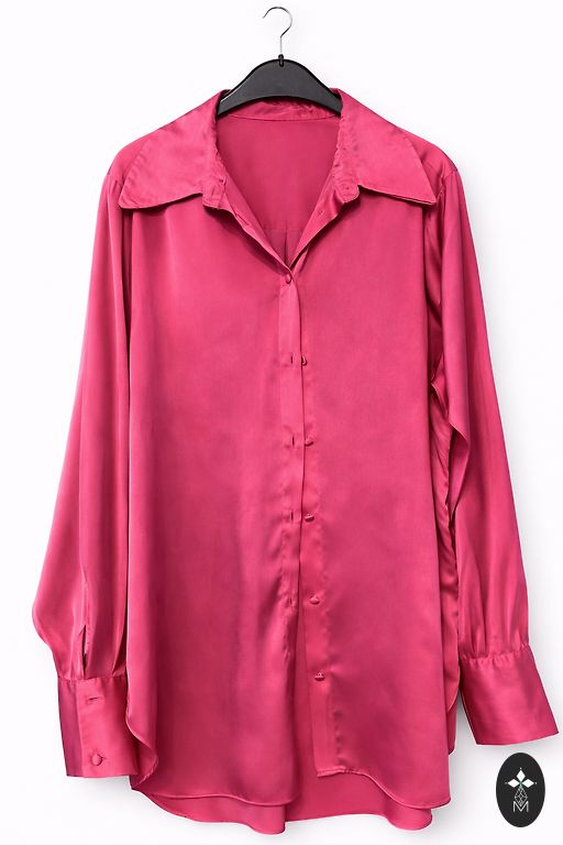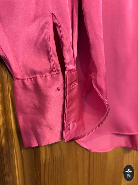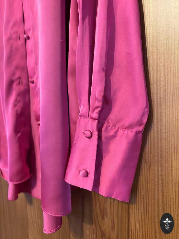 Черная блузка с V-образным вырезом и расширенной нижней частью. Прозрачные, слегка пышные рукава из ткани, похожей на органзу, с резинками на концах рукавов. Пояс не сохранился, но можно носить без него.