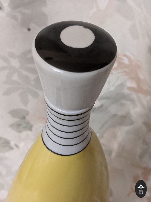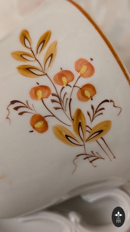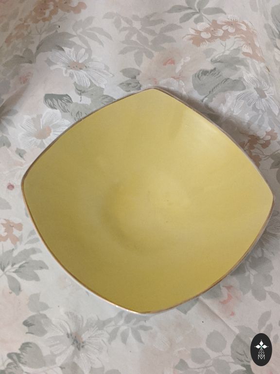 Faience salad bowl, shows signs of use in the gold rim, some unevenness in the material.