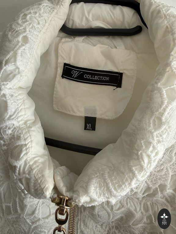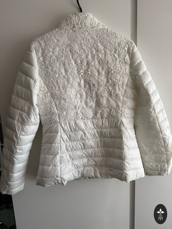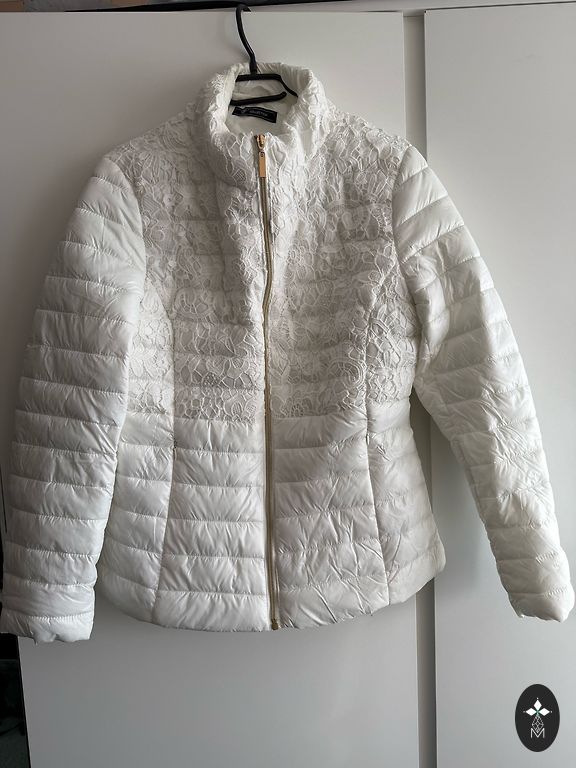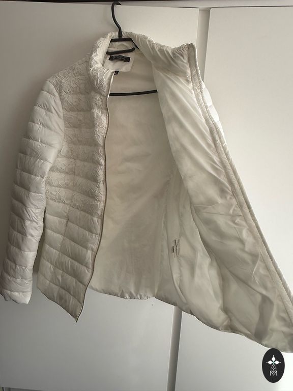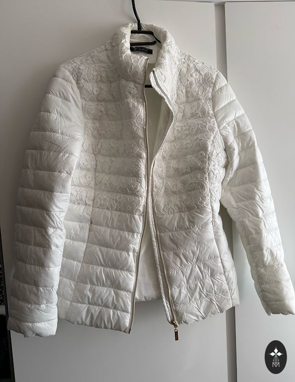 Galima dėvėti atskirai kaip pavasarinę striukę arba kaip papildomą sluoksnį po paltu. Striukė užpildyta pūkais, kurie labai gerai išlaiko šilumą, tuo pačiu metu plona ir nematoma po paltu. Labai geros būklės, be defektų. Po pažastimis 56 cm, šiek tiek susiaurėja ties juosmeniu ir apačioje taip pat 56-57 cm.