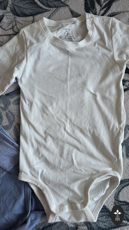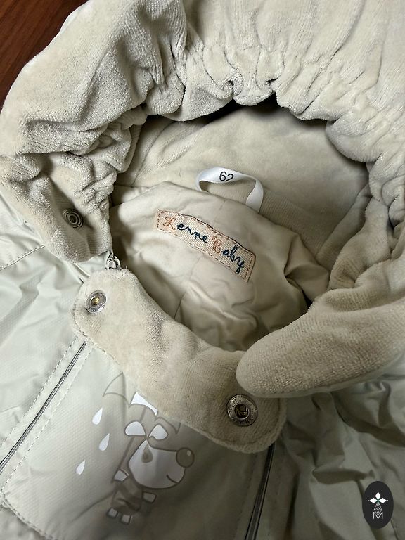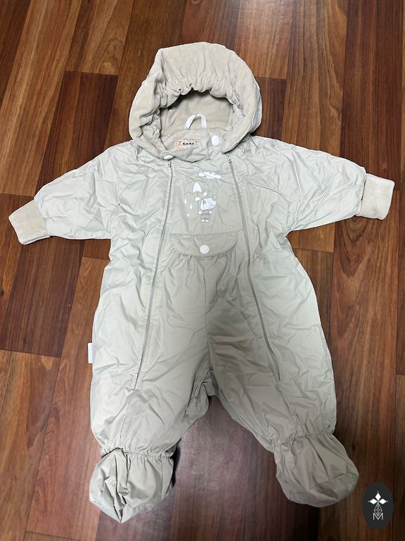 100% puuvill, valmistatud Türgis, ostetud Leedus, uus, pole kordagi kantud, ainult silt on eemaldatud, märgitud 9-12 kuud, kuid mulle tundub, et sobib väiksemale lapsele. Värvus hallikaspruun, soe vooder. Pikkus umbes 60cm, vöökoht 30cm.