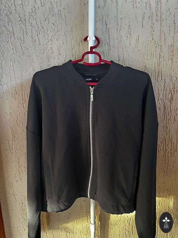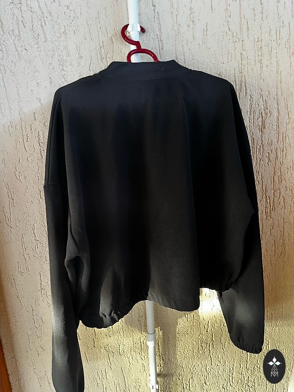 Be užsegimo, segė kaip premija prie pirkimo. Nuleisti pečiai, plačios rankovės. Gana gilios šoninės kišenės. Ilgis 110 cm, krūtinė iki 145 cm.