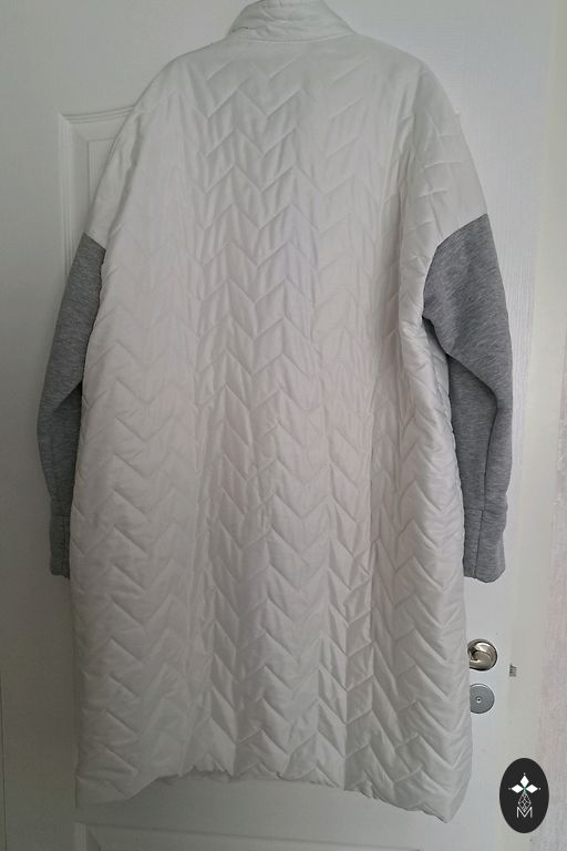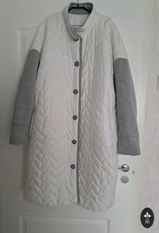Kaip naujas. Matmenys po pažastimis 53 cm x 2, klubai 58 cm x 2, ilgis 83 cm. 2 kišenės, užsegimas su 2 spaudėmis.