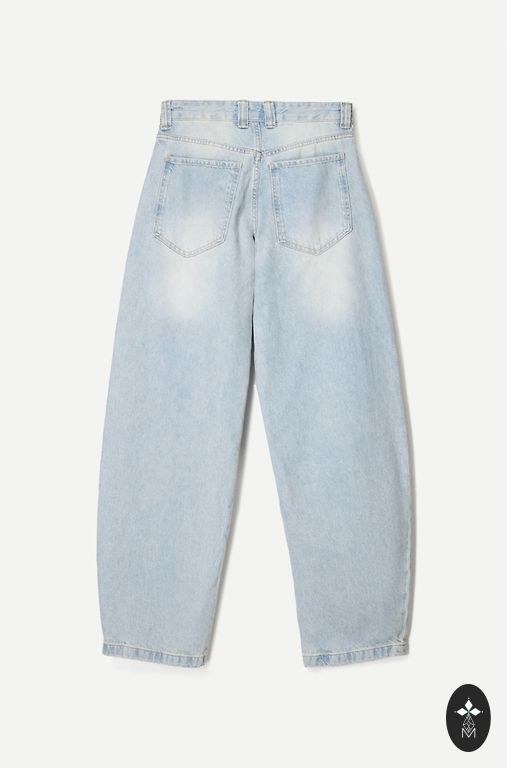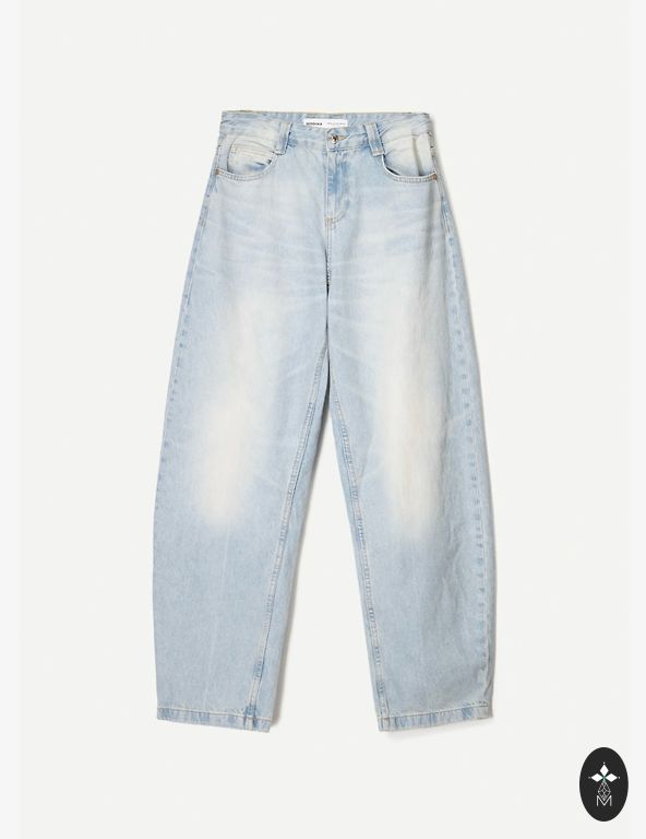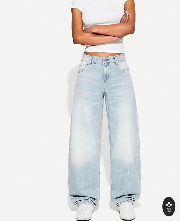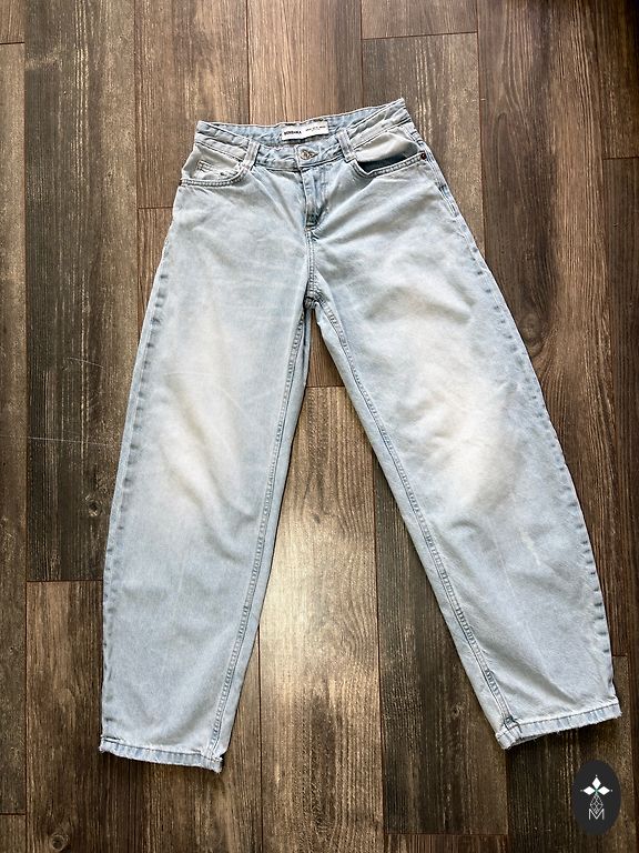 Boyfriend-tüüpi teksad, märgitud nagu suurus 40, kuid sobivad paremini tüdrukule suuremate puusade või tagumikuga.