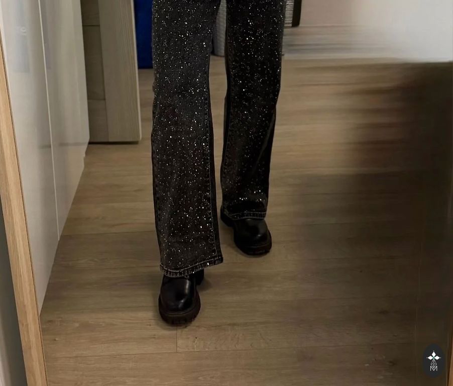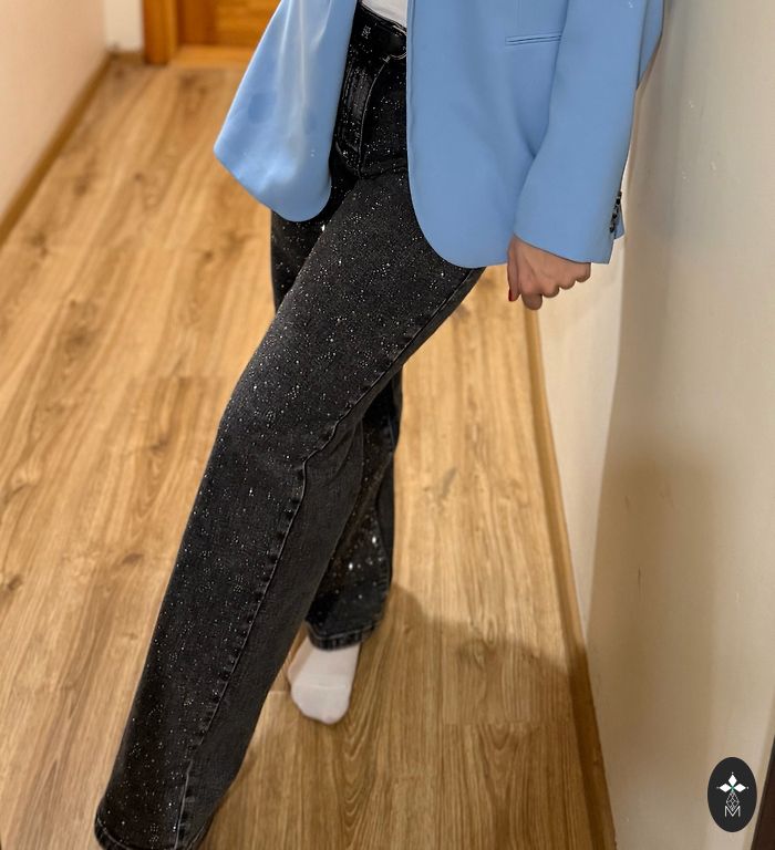Džinsi ir pelēkzaļi ar augstu vidukli un “wide leg” stilu. Vilkti pāris reizītes:)