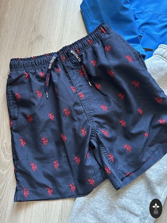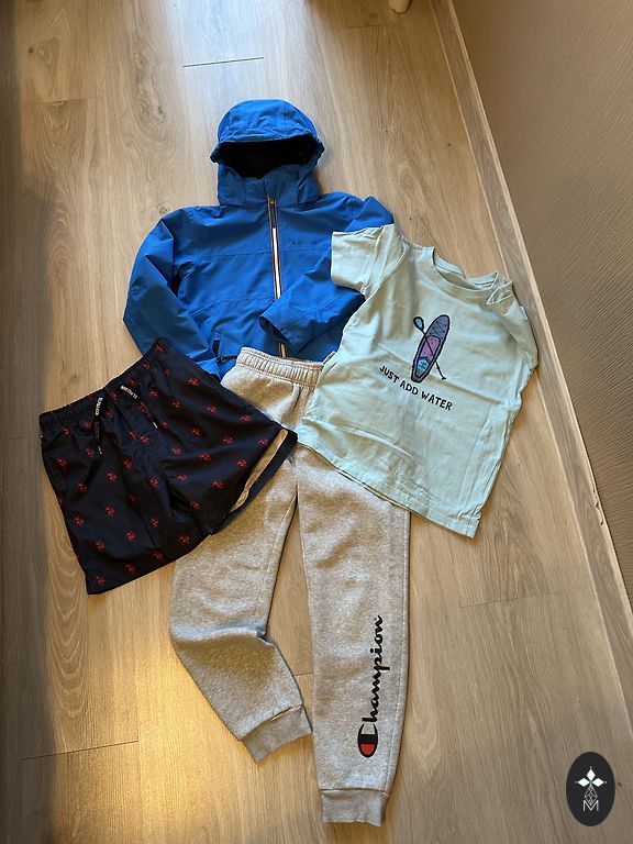 3 megztiniai, 3 poros sportinių kelnių, 3 ilgomis rankovėmis marškinėliai ir vieni sagomis užsegami marškiniai. Visų drabužių dydis 146/152, bet mes nešiojome daug ką ir tada, kai šį ūgį buvome peržengę. Kai kur audinys yra išblukęs ir susivėlęs. Labiausiai pastebima ant pilkų sportinių kelnių. Dėmių ir skylių nėra. Viskas buvo išskalbta.