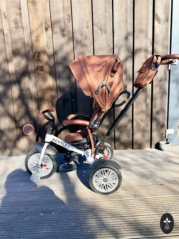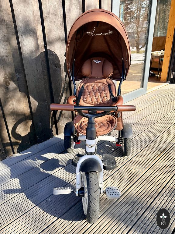 Galima sakyti naujas, pirktas praėjusią vasaros pabaigą, porą kartų naudotas. Vairas reguliuojamas aukščiau ir žemiau, pridedama sėdynė, ant kurios galima atsisėsti, kad būtų patogiau važiuoti.