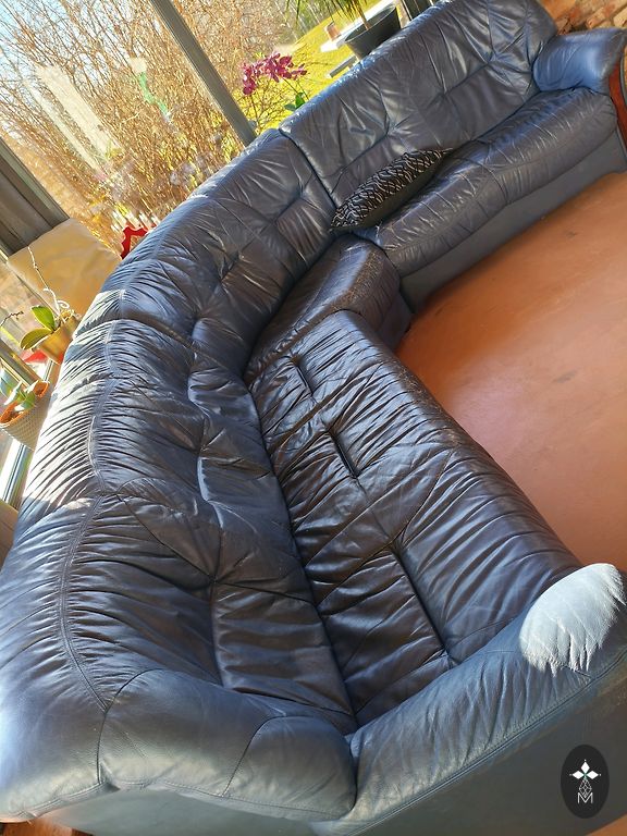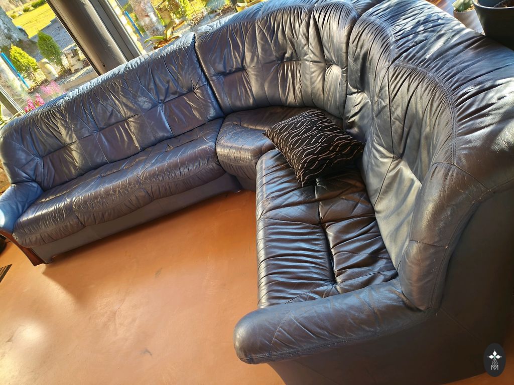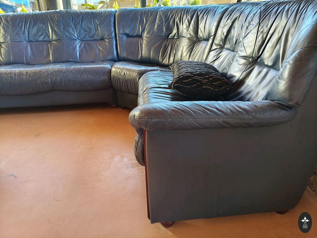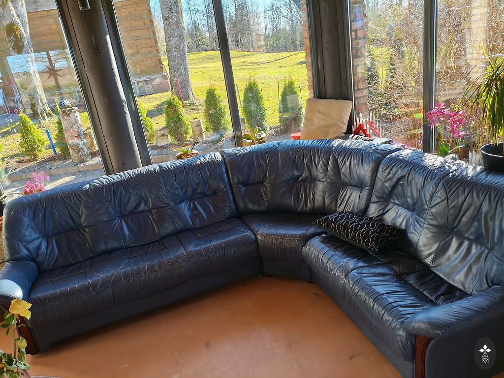 Sofų komplektas. Eko oda. Didžiąją galima išskleisti kaip lovą, tačiau mechanizmas yra sudėtingesnis. Mažąsias dalį galima iš dalies išskleisti patogesniam sėdėjimui.