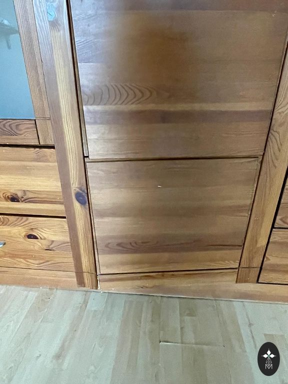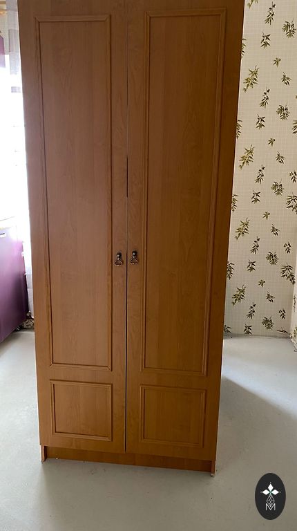 Müüa kaskvineerist raamaturiiul oranžikas kollases toonis. Mööbel ei ole kõige uuem, kuid võib veel kaua kesta, stabiilne ja korralik. Ainult uste alt kriimustatud alumine riiul viitab aastatele.