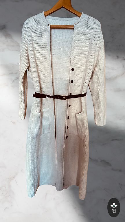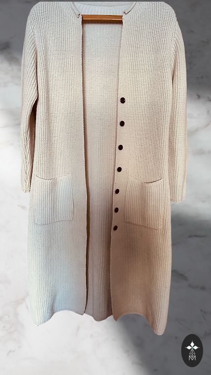 One-size cardigan fits from size S to L. Fits chest up to 100/105 cm perfectly. Beautiful buttons with stones. Patterned knitting. Made of 68% viscose and 32% polyester. Snow-white color. Comfortable for the skin. Luxurious cardigan. Suitable for tall height.