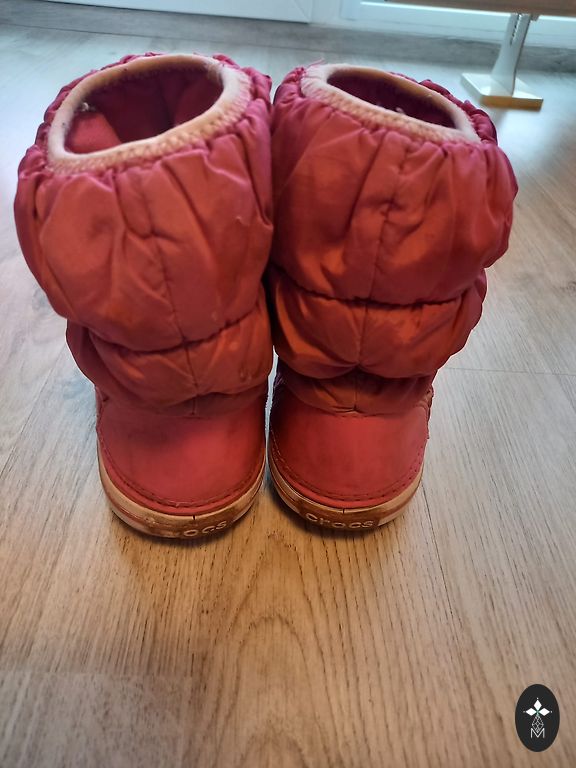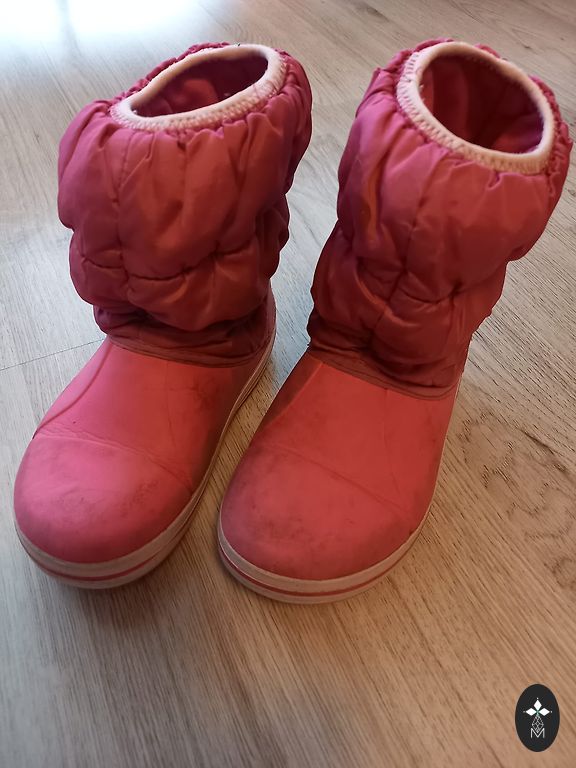 Crocs 9. izmēra zābaki. Crocs zīmīte vienam zābakam nokritusi, otram - nobružāta ( skat. bildē). Citu defektu nav.