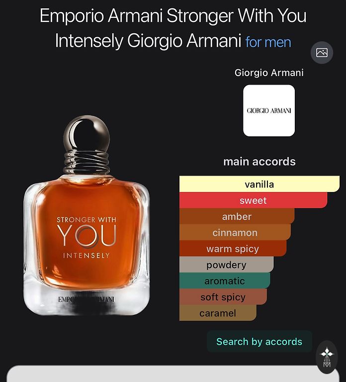 Base notes: amber, sandalwood, musk, oakmoss, caramel, vanilla, tonka bean