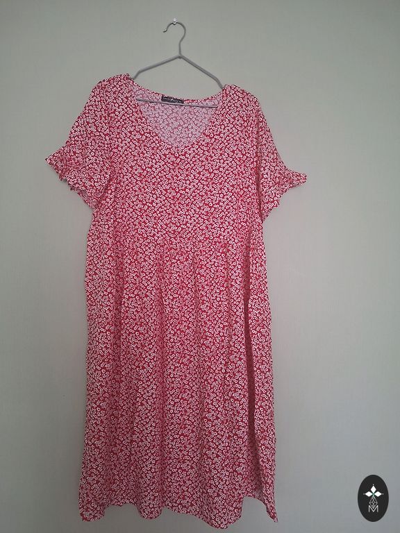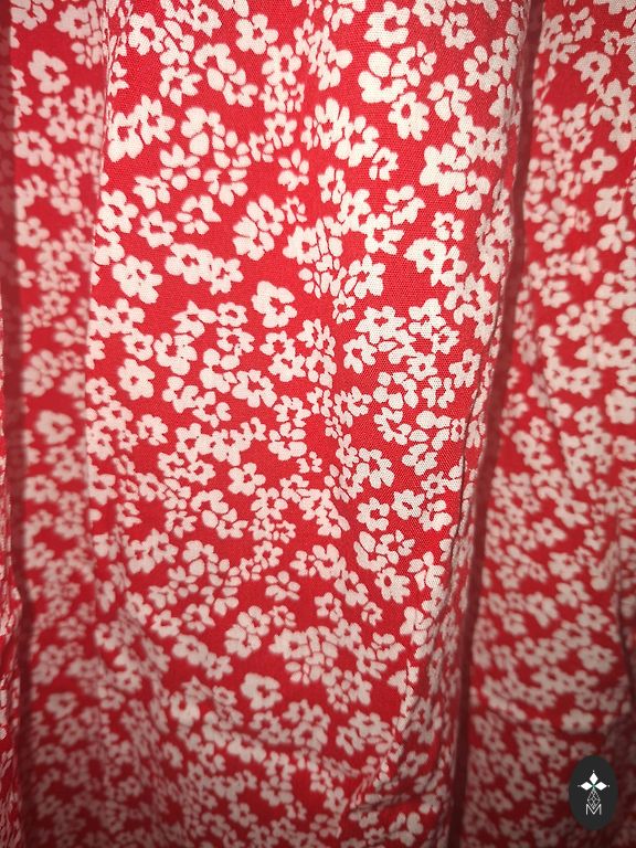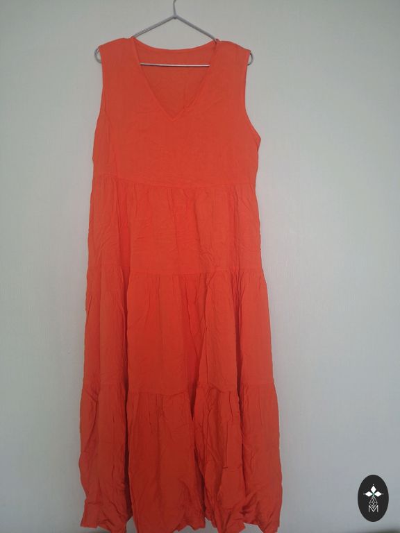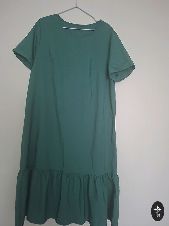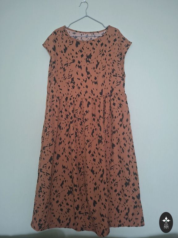 Nelyginta, geros būklės, be defektų, medvilnė. Man atrodo, kad geriau tiktų 38/40 dydžiui, nors nurodyta 40. "A" kirpimas, modelis toks, kad nugara šiek tiek (~10 cm) ilgesnė nei priekinė dalis. Ilgis nugaroje ~100 cm.
