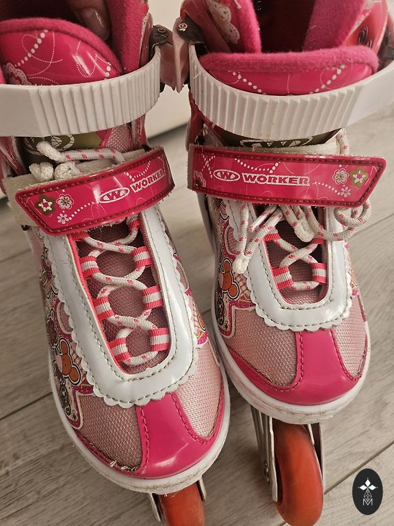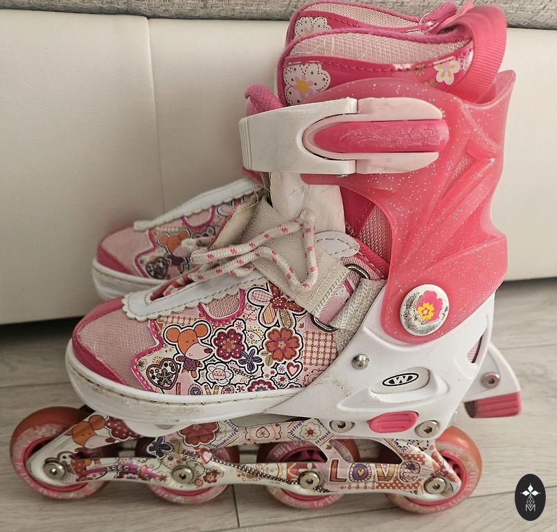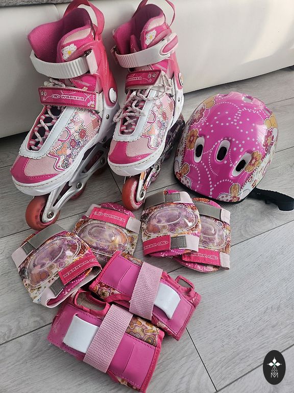 Parduodu vaikų riedučius su apsaugos komplektu Frozen. Komplektą sudaro: Šalmas 2x kelių apsaugos 2x alkūnių apsaugos Reguliuojami dirželiai - galima pritaikyti įvairiems dydžiams. Riedučiai reguliuojami - minimalus ilgis ~15 cm, maksimalus ~20,5 cm. Naudota, bet geros būklės. Nedideli naudojimo požymiai (įbrėžimai), kurie neturi įtakos saugumui. Viskas veikia, tvirtinimai tvarkingi.