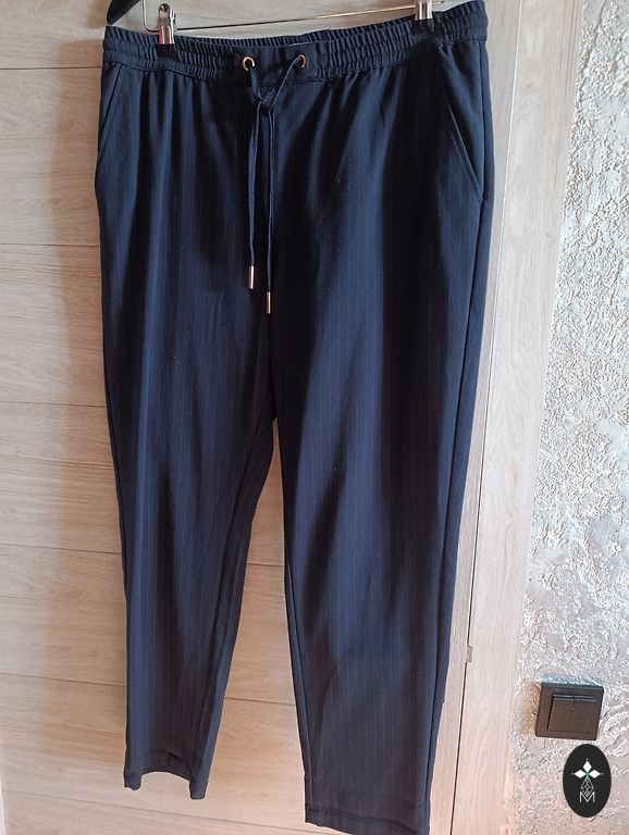 Mõnus kangas, ei kortsu, pesed ja tunni aja pärast kannad. Vööümbermõõt 100. On vooder. Pluss pakiautomaat.